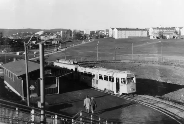 Oslo Sporveier. Sinsentrikken. Trikk motorvogn 224 type Høka MBO linje 7 i den nye endesløyfa ved Muselunden som ble tatt i bruk i 1969. Nordre Åsen i bakgrunnen.