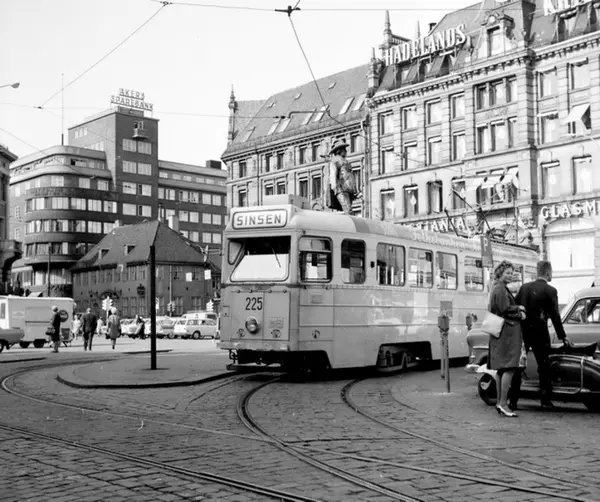 Oslo Sporveier. Stortorvet. Trikk motorvogn 225 type Høka MBO linje 1. En kort periode i 1961 var denne linjen, Majorstuen-Sinsen, delt i to grunnet graverabeider. Østre del snudde på Stortorvet. Ungt par med en Lambretta scooter. GlasMagasinet, Stortorvets Gjæstgiveri.