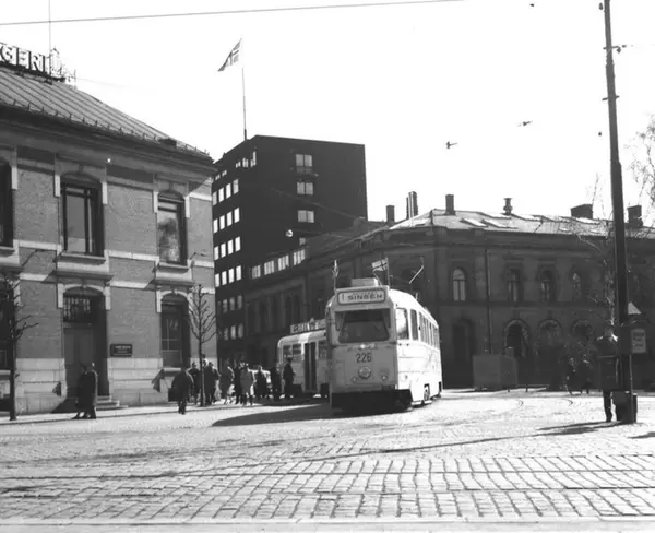 Oslo Sporveier. Trikk motorvogn 226 type Høka MBO linje 1 svinger inn i "17. mai sløyfa" fra Trondheimsveien til Thorvald Meyers gate fordi sentrum er sperret av opptog 1. mai 1975.