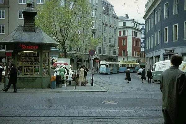 Oslo Sporveier. Trikk motorvogn 228 type Høka MBO linje 7 snur 1. mai i sløyfa ved Professor Aschehougs plass. Eldste type Narvesenkiosk, tårnkiosk. Hotell Bondeheimen. Pølseselgere.