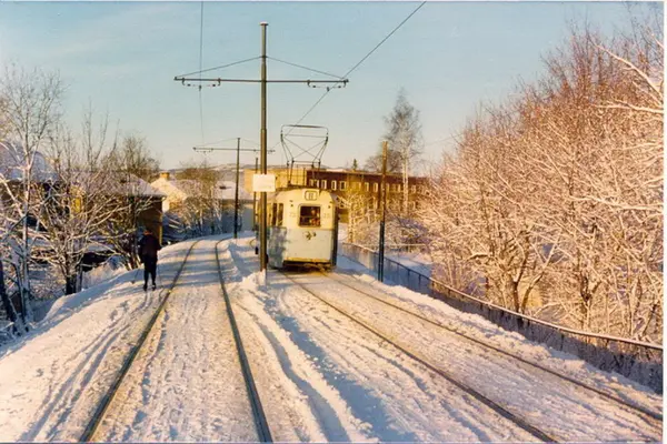 Oslo Sporveier. Trikk motorvogn 231 type Høka MBO linje 11 på den siste biten av Kjelsåsbanen med egen trasé. Skiløper langs linjen, vinterbilde med solskinn.