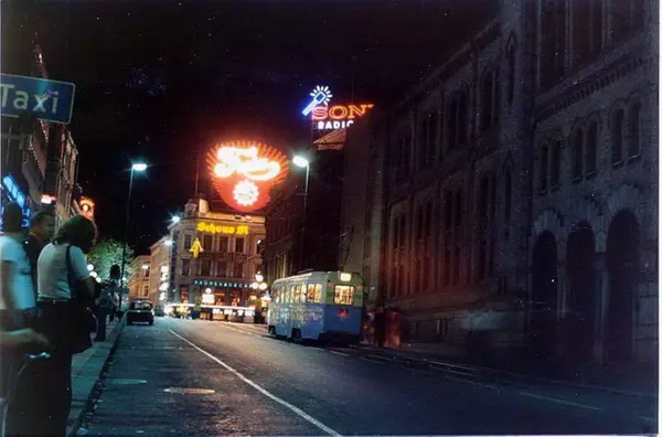 Oslo Sporveier. Trikk motorvogn 239 type Høka MBO linje 11 i Karl Johans gate. Lysreklame for Freia og Schous øl, taxikø ved Stortings plass. Kveldsmørke.