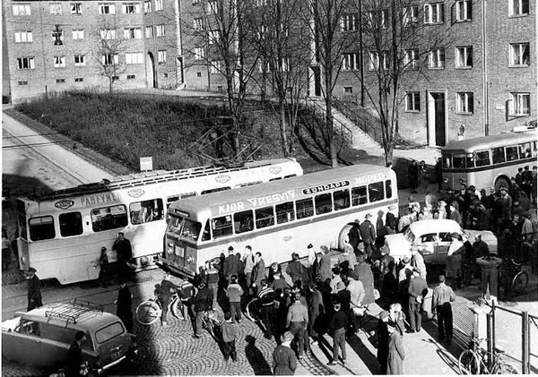 "Oslo Sporveier. Trikk motorvogn type MO ""kylling"" nr. 35 linje 13 i Dælenenggata ved Stockholmgata. Ventende passasjerer, trolig en stans i trafikken som gjør at verken trikken eller trolleybussen på linje 21 kommer fram. Sporveien har satt inn en ""Høka-Leyland"" som erstatning for trolleybussene på linje 21. "