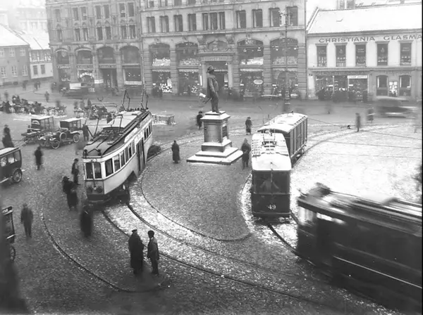 Oslo Sporveier. Stortorvet. Trikk motorvogn 49 type SS ombygd til korntransportvogn med tilhenger i indre sløyfe. Ekebergbanens motorvogn 1008 type B/B i ytre sløyfe. GlasMagasinet (Christiania Glasmagasin), torghandel, torgvogner, Christian IV-statuen.