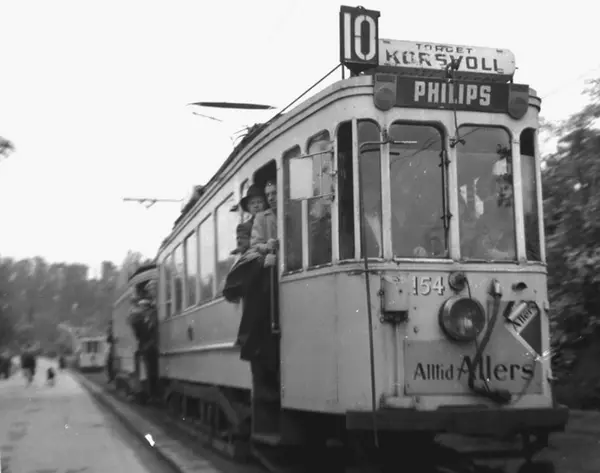 Oslo Sporveier. Trikk motorvogn 154 type HaWa linje 10, Ullevål Hageby-Korsvoll (Bjølsen) over Stortorvet (1940-1949) ved Vestre Aker kirke. Mengden passasjerer tyder på fotballkamp på Ullevaal stadion.