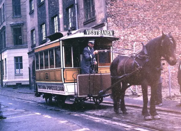 Oslo Sporveier. Hestesporvogn nr. 6 under filmopptak av filmen "Sult". Scenen med hestesporvogna ble tatt opp i Lambertseterbanens vendesløyfe i Vaterland "Vognmannsgata" Reperslagergangen som på den tida kun ble brukt av ekstravogner i rushtida.