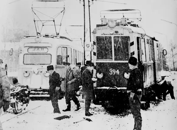 Trikk motorvogn 394 type A (arbeidsvogn, tidligere i trafikk på Lilleaker-stensjøbanen) avsporet ved Godlia på Østensjøbanen. Motorvogn type Gullfisk B1 (fra 1939). Arbeide med å få vogn 394 løs. Snøkav.