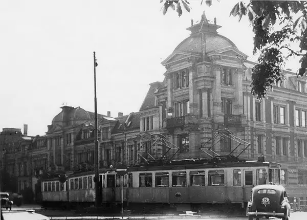 Oslo Sporveier. Trikk motorvogn og to tilhengere type A på Lilleaker-Østensjøbanen, her ved Det engelske Kvarter (fransk nyklassisisme, revet 1964-1965) ved Solli plass.