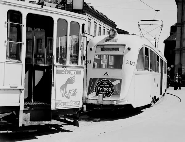 Oslo Sporveier. Trikker i sporsløyfe 2 på Jernbanetorget. Motorvogn 201 type Gullfisk B1, og eldre toakslet motorvogn. Jernbanegata i bakgrunnen. Østbanestasjonen til høyre i bildet.