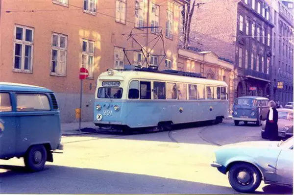 Oslo Sporveier. Trikk motorvogn 201 type Gullfisk B1 på linje 9B, Skøyen-Østbanen, i Tollbugata mot Dronningens gate, ved den gamle Krigsskolebygningen.