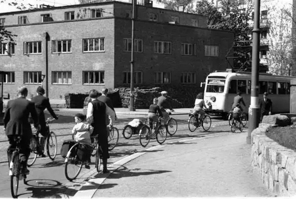 Trikk motorvogn (fra 1939) type Gullfisk B1 nr. 201 på linjen Lilleaker-Østensjøbanen (A/S Bærumsbanens linje Kolsås-Oppsal), her på Drammensveien ( 116A og B) ved Sigurd Syrs gate. Familier på sykkelutflukt St. Hansaften 1941).