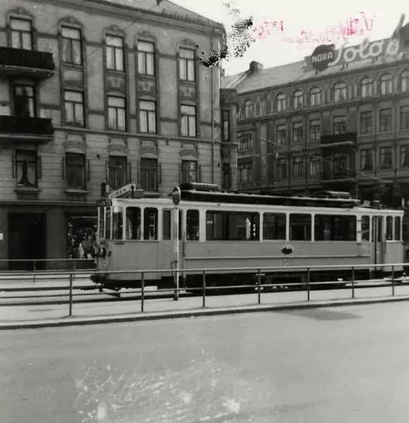 "Oslo Sporveier.Trikk motorvogn 156, tidligere Grønntrikk fra 1899, ombygget 1921. Her på endeholdeplassen i Kirkeveien på linje 11, Majorstuen-Disen. Utrangert 1966. Bogstadveien 66 bakerst med takreklame for Nora Solo. Tilbakemelding: ""Legg merke til den uvanlige togsammensetningen. Det ser ut til at to motorvogner er koblet sammen og den bakerste mangler pantograf. Se også den skjeve skiltblokken bak. Alt tyder på at dette er en vogn som slepes til Vålerengen for opphugging og da må bildet være fra omtrent 1968 (det kan kontrolleres ut fra å slå opp vognnummeret (nr.156) for hoggedato)."" (19.4.2012)"