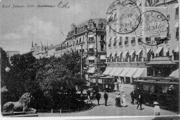 Eidsvolls plass ved Karl Johans gate. Trikker, Grand Hotel, spaserende. Løve på Løvebakken. (Kristiania i originaltittelen overstreket og rettet til Oslo.) Postkort med poststempler fra 1911.