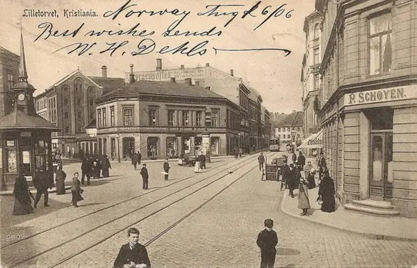 Brugata over Lilletorget opp mot Storgata, Stenersgata inn til venstre. Spaserende, Narvesens tårnkiosk, drakjerrer, trikk, torgsalg. P. Schøyen vinforretning (fra 1866) til høyre (Brugata 11). Takreklame for Morgenposten. Postkort 8307? med påskrevet hilsen.