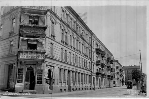 Lassons gate sett fra vinmonopolutsalgs- og kolonialbutikken på hjørnet mot Parkveien. Grønntrikk på linje 9 fra Munkedamsveien (etablert 1916). Postkort 176.