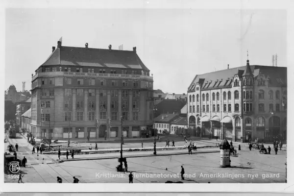 Jernbanetorget med nyoppført bygg / hovedkontor for Amerikalinjen (ferdig 1919). Karl Johans gate 2 til høyre. Trikk i Lille Strandgade (nåværende Strandgata). Store Strandgate (nåværende Fred. Olsens gate) innover til høyre. Nedstigningstårn, hestetransport, spaserende. Postkort 1524.