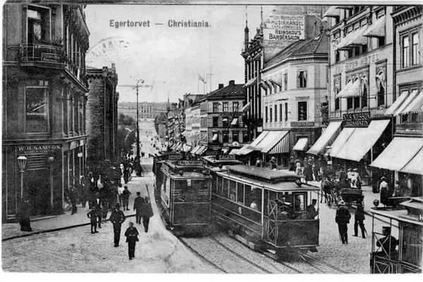 Karl Johans gate fra Egertorget til Slottet. Trikker, spaserende, folkeliv. W. B. Samson på hjørnet, Fru Byes Hotel. Veggreklame, butikkskilt. Postkort