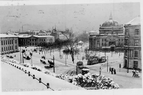 Utsikt fra Abelhaugen mot Universitetet, Studenterlunden og Nationaltheatret. Trikker, biler. Vinterstemning med hester og sleder, spaserende. Postkort.