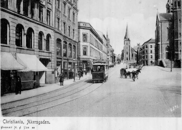 Akersgata ved Trefoldighetskirken opp mot St. Olavs kirke. Trikker, spaserende, hest og kjerre. Leiegården Maltheby (i midten), Teatergata 1 nedenfor. Postkort 22.