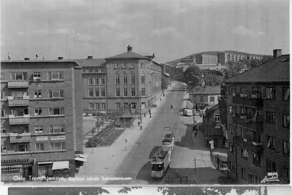 Trondheimsveien sett nordover fra Carl Berners plass. Sophies Minde. Trikk kjører nedover Trondheimsveien. (Linje nummer 13 kjørte til Sinsen mellom januar 1940 og januar 1949.) Postkort, 8896