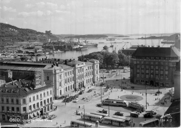 Torget med bussterminal, trikk i sløyfe og drosjeholdeplass. Østbanebygningen, Amerikalinjens hovedkontor, Paléhaven. Bjørvika bakenfor med Nylands Verksted. Postkort 1124 A 2