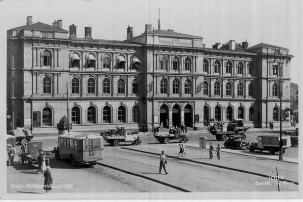 Østbanebygningen, Jernbanetorget 1. Buss ved holdeplass, biler, lastebiler. (Trikkesløyfer ennå ikke anlagt, bildet tatt således før 1950.) Postkort 1004.