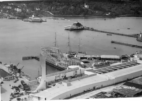 VI KAN-utstillingen. Utstillngsområde, paviljonger, fornøyelsesavdeling (berg- og dalbane, eventyrtog, rakettbiler m.m.), skulpturen "Kniven" (Arne Korsmo). Havnekraner, seilskute, Kongen, Dronningen, Frognerkilen. (Utstillingen fra 12. mai til 18. september 1938 skulle fremheve byens modernitet og fremskritt innen håndverk, industri og sosialpolitikk, og hadde rundt 1 million besøkende.) Postkort 11.