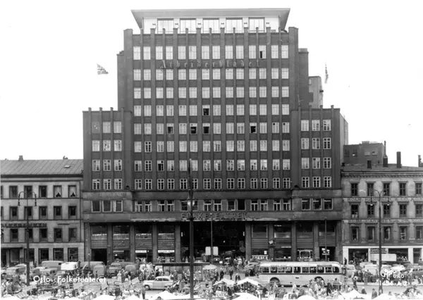 Folketeaterbygningen, Folketeatret, Arbeiderbladets kontorbygg, fasaden mot Youngstorget (Nytorvet inntil 1951). Torgsalg, torgboder, buss, biler. Postkort 1654? A 2.