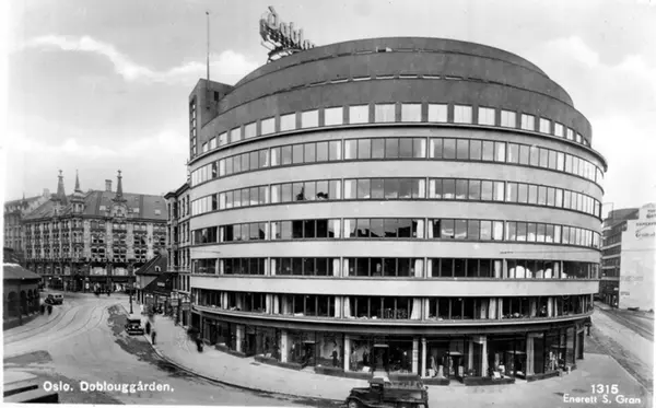 Den nye forretningsgården i buet funkis for Brødrene Dobloug fra 1933, Dronningens gate 40. Butikker. (Den gamle fra 1901 i bakgrunnen til venstre, Storgata 1.) Postkort 1315.