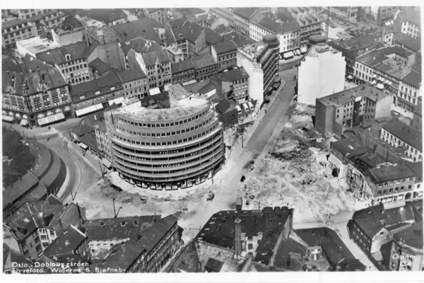 Den nye forretningsgården (fra 1933) i buet funkis for Brødrene Dobloug, Dronningens gate 40. Tomt for Hotell Viking. Gammel bebyggelse langs Gunnerus' gate mot Kirkeristen. Skippergata, Nygata og Storgata. Postkort 124. (Flyfoto)