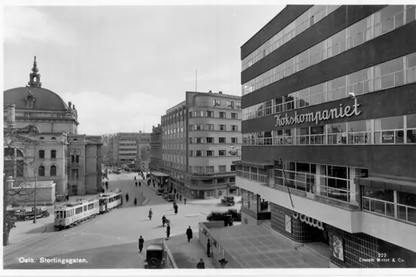 Stortingsgata fra Odd Fellow-bygningen forbi Nationaltheatret og Hotel Continental mot Universitetsgata. Tivolis restaurant- og inngangsbygning anes i bakgrunnen (revet 1934). Trikk, biler, spaserende. Postkort 222.
