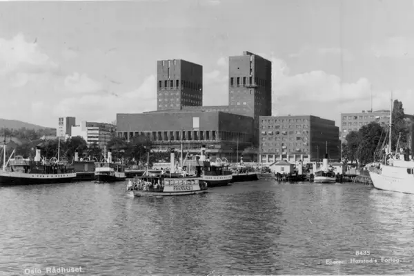 Oslo Rådhus, Rådhusbryggene, forretningsbygg. Dampbåter, "Framnæs 1", ferge mot Bygdøy. På vei ut fra Utstikker B går D/S Kronprins Olav, mens D/S Nesodtangen ligger fortøyd (damp ut av pipa). Ved Utstikker A ligger D/S Oksvald ytterst, delvis skjult av Framnesfergen. Postkort 8435.Datering: 1938-41