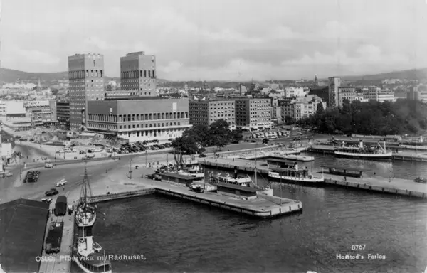 Oslo Rådhus, Rådhusplassen, Rådhusbryggene (Utstikker A, B, C, D). Forretningsbygg, Kronprinsesse Märthas plass under opparbeidelse (inntil 1955 kalt Solplassen). Dampbåter, seilskute. D/S Nesodtangen ligger ved Utstikker B. Ved Utstikker C ligger D/S Oscar. Havnebanen, busser, biler. Postkort 8767. Datering: 1938-41