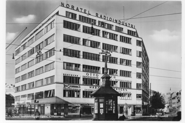 Industribygningen (fra 1934) ved Lilletorget, forretnings- og kontorbygg på hjørnet Brugata - Stenersgata. Noratel A/S, apparat- og transformatorfabrikk, samt ulike andre produksjonsvirksomheter. Firma- reklame- og butikkskilt, butikker. Narvsens tårnkiosk. Postkort 9016.