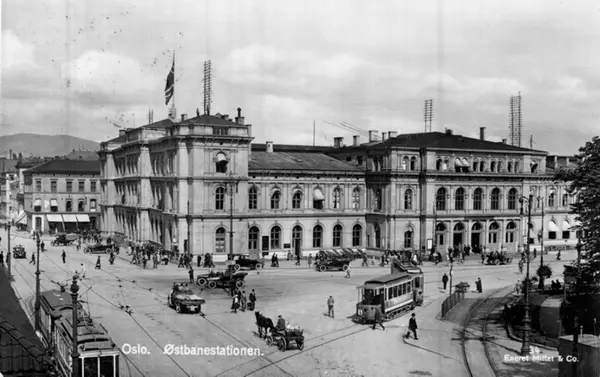 Østbanebygningen, Jernbanetorget 1, sett ved Christian Frederiks plass og Paléet. Trikker, biler / drosjer, hest og kjerre. Jernbanetorget til venstre, bygård ved Jernbanegata. Postkort 34.