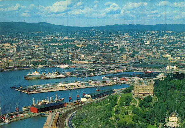 Panoramabilde. Bjørvika og Bispevika sett fra Ekeberg over Sjømannsskolen. Grønlikaia (nærmest), Sørengutstikkeren, Sørengkaia, Paulsenkaia, Bjørvikautstikkeren med Nylands mek. Verksted. Havnelager, havnekraner, båter. Ekebergskråningen. Postkort.