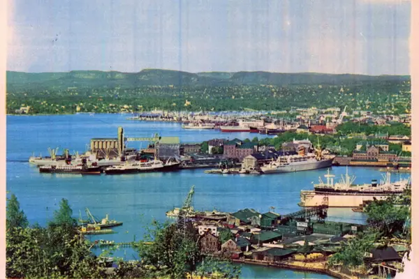 Sørenga, Sørengkaia, Vippetangen (med kornsiloer) og Akershus festning sett fra Ekebergskråningen. Havnelagre, havneskur, havnekraner, båter, amerikabåt ved Utstikker I, skip i dokk ved Nylands mek. Verksted. Skip ved Akers mek. Verksted i bakgrunnen. Postkort.