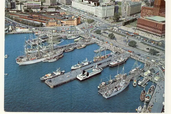 Rådhusbryggene (utstikkerne A til D) med seilskuter, ferger og mindre båter.På østsiden av Rådhusbrygge 2 ligger M/S Prinsen (innerst) og M/S Huldra. Ytterst på vestsiden ligger M/S Tyrihans, eller søsterskipet M/S Prinsessen. Innenfor ligger M/S Lykkeper. På østsiden av Rådhusbrygge 1 ser vi veteranskipet KNM Alta, pensjonert minesveiper, bygget i tre. Innerst ved Akershuskaia ligger veteranskipet D/S Børøysund, og på utsiden ligger veteranskipet D/S Styrbjørn, pensjonert taubåt. Rådhusplassen, Rådhuset, Vestbanen. Kontor- og forretningsbygg. Dokkveien, Dronning Mauds gate, Haakon VIIs gate, Roald Amundsens gate (dagens Olav Vs gate). Postkort. (Flyfoto)Datering: 1974 - 80