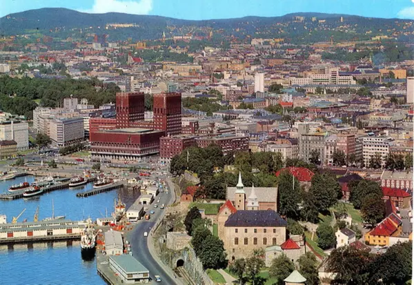 Akershus slott og festning, vestre Akershusstranda, Rådhusbryggene, Rådhusplassen, Rådhuset sett ovenfra fra syd. Akershusutstikkeren, båter, havneskur. Kontor- og forretningsbygg i Vika. Postkort.