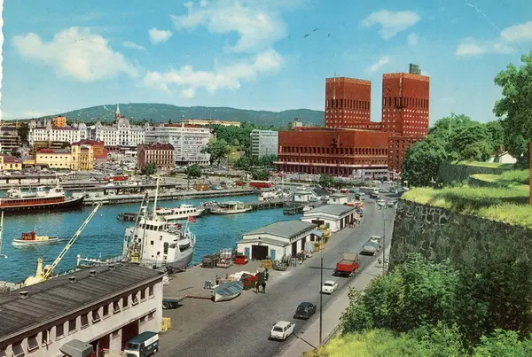 Nordre Akershuskai med havneskur. Rådhusbryggene: M/S Prinsen ligger ved Utstikker B, mens vi kan skimte litt av M/S Tyrihans eller søsterskipet M/S Prinsessen på den andre siden av utstikkeren, bak venteskuret. Ytterst ved Utstikker A ligger Oslo kommunes Sjøbad I. Rådhusplassen, Rådhuset, Vestbanen, Wilhelmsengården, Thiisgården og Victoria terrasse sett oppe fra festningsmuren langs Akershusstranda. Postkort.