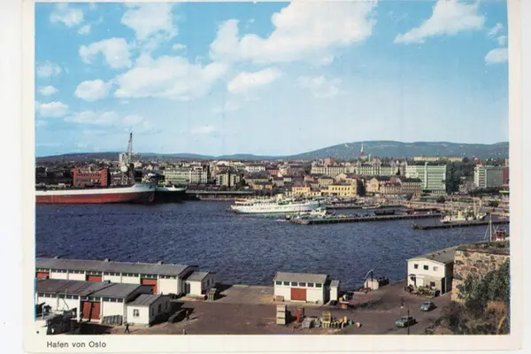 Pipervika sett fra Akershusutstikkeren mot Rådhusbryggene (utstikkerne), Vestbanen, nye og gamle Vika og Akers mek. Verksted. Skip ved Tingvallakaia. Havnelagre, havneskur. Postkort.