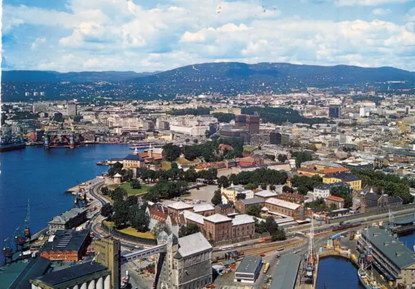Vippetangen med kornsiloer, Fiskehallen, havnebygg (Oslo Havnevesen), havnelagre, havnekraner, Utstikker I med Amerikalinjens terminalbygning. Vippetangkaia. Akershusstranda. Akershus slott og festning. Pipervika med Rådhuset og Akers mek. Verksted i bakgrunnen (oljeplattform under bygging). Postkort.