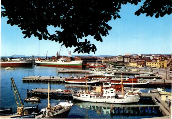 Rådhusbryggene, Utstikker A (nærmest) til D. Innerst ved østsiden av Utstikker B ligger M/S Oksvald foran M/S Nesodden. På vestsiden, delvis skjult av venteskuret, ligger M/S Prinsen. M/S Drøbak på vestsiden av Utstikker A, bak M/K Barodd. Skip ved Akers mek. Verksted. Rådhusplassen, Vestbanen, Dokkveien. Postkort.Datering: 1962 - 1964.