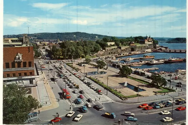 Rådhusplassen med gjennomgangstrafikk og parkeringsplass foran Rådhuset. Bassenger, fonteneanlegg, statuer. Akershus slott og festning. Rådhusgata, Akershusstranda. Postkort.Rådhusbryggene med Honnørbrygga. M/S Veslefrikk og M/S Prinsen ved Utstikker B. Til høyre bak Prinsen ligger M/S Tyrihans eller søsterskipet M/S Prinsessen. Ved Utstikker A ligger M/S Showboat, ex nesoddbåten M/S Oksvald. Datering: 1970-1971
