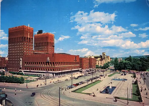 Rådhuset og Kronprinsesse Märthas plass (Solplassen inntil 1955) sett fra vest. Biler langs Rådhustrappen. Parkerte biler, trikketrasé,spaserende. Parterre med bassenger, fonteneanlegg. Rådhusgata, utløpet av Roald Amundsens gate (nåværende Olav Vs gate). Postkort.