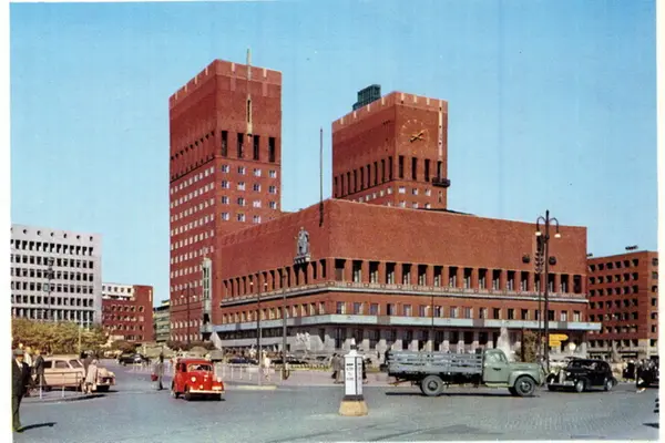 Rådhuset sett fra sørvest. Kontor- og forretningsbygg. Kronprinsesse Märthas plass. Lastebil, biler ved utløpet av Roald Amundsens gate (nåværende Olav Vs gate). Postkort.