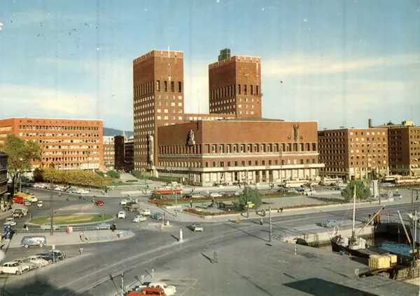 Rådhusplassen med fonteneanlegget, Rådhuset, Kronprinsesse Märthas plass sett fra sydvest ved Dokkveiens utløp. Kontor- og forretningsbygg. Rundkjøring, busser, biler. Utløpet av Roald Amundsens gate (nåværende Olav Vs gate). Postkort.