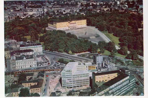 Gamle og nye Vika. Sanering. Øvre del av Haakon VIIs gate (navn fra 1954, tidligere Bakkegatens trasé) under fullførelse fra Munkedamsveien opp mot Ruseløkkveien. Ruseløkkbasarene, Victoria terrasse. Kommunenes Hus (1956-1957) i midten. Triangelplassen, den senere 7. juni plass (Utenriksdepartementets bygning ennå ikke bygget, sto ferdig 1963), Drammensveien. Slottet, Slottsplassen, Slottsparken. Torstedgården, Odd Fellow-bygningen (ned til høyre). Postkort.