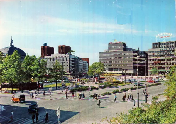 Krysset Frederiks gate - Karl Johans gate sett mot Stortingsgata. Studenterlunden. Torstedgården, Odd Fellow-bygningen, Hotel Continental. Trikk, biler, spaserende. Postkort.