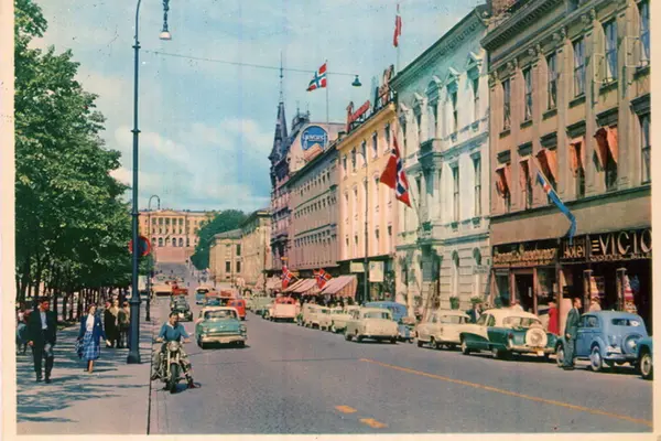 Karl Johans gate fra Victoria kino og Belvedére Hotel, langs øvre Eidsvolls plass til Universitetet og Slottsbakken. Flaggpyntede kontor- og forretningsgårder. Butikker, butikkskilt. Gatelykter. Biler, mann på motorsykkel, spaserende. Postkort.